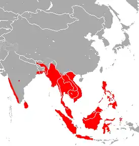Распространены в странах Южной и Юго-Восточной Азии: Индонезия, Индия, Индокитай и Малайский полуостров, Шри-Ланка, Андаманские острова, Суматра, Борнео, Молуккские острова, Филиппины, Сулавеси и другие индонезийские острова. На Борнео встречаются в Сепилоке, районе залива Дарвел в Сабахе, Ниахе и Кучинге в Сараваке, верхнем Капуасе на Западе и верхнем тенге на юге страны.