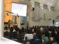 | Малайский язык сосуществует с английским в современной Малайзии | Служба на малайском в католической церкви г. Серембан |