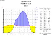 Климат в Малакале — субэкваториальный, типичный для саванны с чётко выраженным влажным и сухим сезоном. Осадков в год выпадает 785 мм. Среднегодовая температура в Малакале составляет 26,5 градусов Цельсия. Влажный сезон наступает в мае и длится до октября.