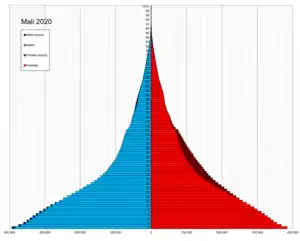 Население страны очень молодое. Доля лиц младше 15 лет составляет 46,6 %, лиц в возрасте от 15 до 64 лет — 48,4 %, лиц старше 65 лет — 3,2 %. Годовой прирост населения составляет 3,6 %. В последние десятилетия рост населения ускорился (1,7 % в период с 1976 по 1987 год и 2,2 % в период с 1987 по 1998 год). При нынешних темпах население Мали удвоится почти за 20 лет.[53]