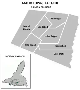 Техсил граничит с аэропортом Джинна и военным городком на севере и западе, с Шах-Файсалом и ручьём Тадо-Налло на юге, с Гадапом на востоке вдоль реки Малир. Состоит из 7 союзных советов.
