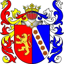 Щит напол-разделенный; в правом красном поле золотой лев, вправо; в левом же, голубом, пять роз на серебряной перевязи, влево. В навершии шлема дворянская корона.