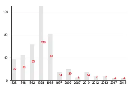 | 1838 | 1848 | 1862 | 1928 | 1965 | 1997 | 2006[19] |