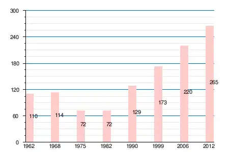 | 1962 | 1968 | 1975 | 1982 | 1990 | 1999 | 2005 | 2006 | 2010 | 2011 | 2012 |