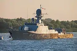 21631 «Буян-М» — малый ракетный корабль на базе проекта 21630 типа «Буян» с полным водоизмещением 949 т. Вооружен вертикальной пусковой установкой комплекса 3Р-14 УКСК на 8 ракет «Калибр» или «Оникс», 100 мм артиллерийской установкой А-190-01 «Универсал»,30 мм артиллерийской установкой АК-630М-2 «Дуэт», двумя пусковыми установками комплекса 3М-47 «Гибка», двумя 14,5 мм пулеметными установками МТПУ и тремя 7,62 мм пулеметами.[4]