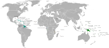В настоящее время Департамент по экономическим и социальным вопросам ООН насчитывает 57 малых островных развивающихся государств. Они подразделяются на три географических региона: Карибский бассейн;[2] Тихий океан;[3] и Африка, Индийский океан, Средиземное и Южно-Китайское моря (AIMS),[4] включая ассоциированных членов региональных комиссий. В каждом из этих регионов есть свой региональный орган сотрудничества: Карибское сообщество, Форум тихоокеанских островов и Комиссия по Индийскому океану, соответственно, членами или ассоциированными членами которых являются многие МОРАГ. Кроме того, большинство (но не все) МОРАГ являются членами Альянса малых островных государств (AOSIS), который выполняет лоббистские и переговорные функции в интересах МОРАГ в системе Организации Объединённых Наций. На веб-сайте ЮНКТАД указано, что «ООН никогда не устанавливала критериев для определения официального списка МОРАГ», но для аналитических целей на своем веб-сайте имеется более короткий неофициальный список.[5]