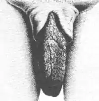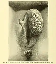 ![]() Женская вульва, малые половые губы и головка клитора выделены | |