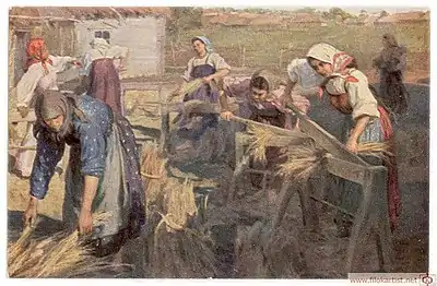 Возделывание и обработка льна неоднократно становились темой произведений изобразительного искусства. Им посвящены картины «Крестьянка, расчёсывающая лён (Анисья)» А. Г. Венецианова (1822), «Прядильщица льна» Ж. Бретона (1872), «Прополка льна во Фландрии» Э. Клауса (1887), «Льнопрядильня в Ларене» М. Либермана (1887), «Крестьянка, молотящая лён» В. Ван Гога (1889), «У своей полосы» В. М. Максимова (1892), «Мяльщицы льна» Ф. В. Сычкова (1905), «Страда молотьбы льна» А. Жмуйдзинавичюса (1926), «Лён» Т. Н. Яблонской (1977) и других художников[34].