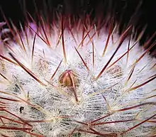 Отличительной чертой растений рода маммиллярия является специфическое строение ареолы, которая разделена на две пространственно разграниченные части. Такие ареолы называются диморфными[6]. В части ареолы, расположенной на верхушке сосочка, обычно формируются колючки (очень редко цветки), а часть, расположенная в пазухе сосочка, - аксилла - всегда свободна от жестких колючек, хотя часто в ней образуется опушение, волоски и/или щетинообразные колючки, в ней формируются цветки и боковые побеги. У целого ряда видов опушение в аксиллах появляется или становится более выраженным с наступлением генеративного возраста, порой особенно в аксиллах, в которых формируются цветки, так что на растениях образуются кольцеобразные участки, покрытые более густым опушением и волосками.