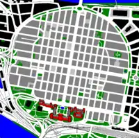 «Прозвище» Мангейма — «Quadratestadt» (город квадратов). Начиная от замка и до реки Неккар простирается исторический центр города — т. н. «квадраты» — прямоугольные блоки зданий, разделённые улицами, перпендикулярными и параллельными стенам замка. Квадраты носят названия, состоящие из буквы и числа (например, «A1» или «M7»), которые распределены относительно замка и главной улицы города, проходящей от фасада замка до моста через Неккар. Эта улица носит название Kurpfalzstrasse, но горожанами именуется исключительно как Широкая улица (нем. Breite Strasse[4]). Она находится наполовину в пешеходной зоне, в которой расположены многочисленные магазины и административные здания.