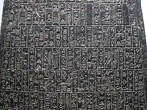 ![]() Фрагмент текста стелы Маништушу. Лувр | |