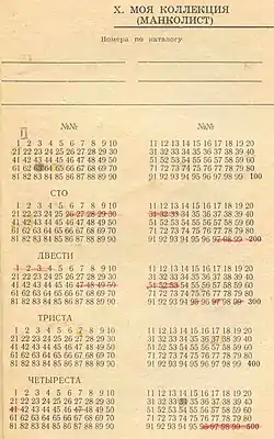 - Напечатанная таблица с указанием всех номеров подряд, где нужные номера либо подчёркнуты либо обозначены какой-либо другой пометкой, либо наоборот вычеркнуты номера имеющихся в коллекции марок.