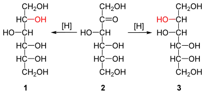 В промышленных масштабах маннит 3 получают восстановлением фруктозы 2 (вместе с сорбитом 1):
