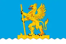 - Флаг городского округа город Мантурово представляет собой прямоугольное голубое полотнище с отношением ширины к длине 2:3, воспроизводящее композицию герба города: несущее вдоль нижнего края белую волнистую полосу, ширина которой составляет 2/15 ширины полотнища, и вплотную к полосе — жёлтое с красными, чёрными и оранжевыми деталями изображение грифона, плывущего на бревне
