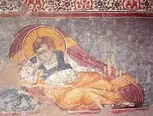 Евангелист на острове Патмос диктует своему собственному ученику Прохору текст Книги Откровения. Отличительными признаками являются то, что Прохор сидит напротив Евангелиста и пишет на коленях, а также фоновый пейзаж зеленых холмов острова[7]Эта фреска стала отдельным иконописным сюжетом, который позже занял своё место в иконописи