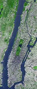Остров Манхэттен расположен близ впадения реки Гудзон, омывающей его с запада, в бухту Аппер-Нью-Йорк-Бей. От материка, на котором расположен район Бронкс, на северо-востоке Манхэттен отделен проливом Харлем, от острова Лонг-Айленд на востоке и юго-востоке — проливом Ист-Ривер.