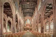 Церковь перестроена в стиле перпендикулярной готики после того, как в 1421 году основана коллегия, а до этого была приходской. К концу XV века под руководством Джеймса Стэнли II неф и хор были перестроены с увеличением высоты окон, под перекрытием нефа помещены ангелы с позолоченными музыкальными инструментами, изготовлены места для клириков и аналой. Сильную реставрацию церковь претерпела в Викторианскую эпоху, в XX веке пострадала от бомбардировок и реставрировалась снова.