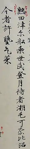 - Один иероглиф передаёт две или более моры: 信 (しな), 覧 (らむ), 相 (さが)