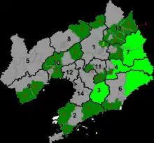 | Даньдун | Куаньдянь-Маньчжурский автономный уезд | 寛甸滿族自治縣 | 宽甸满族自治县 | Kuāndiàn Mǎnzú Zìzhìxiàn | Kuwandiyan Manju Zizhixian | Куаньдянь |