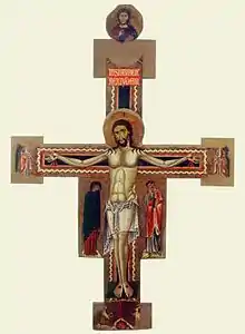 - 10. Расписной крест. Происходит из ц. Санта Мария делла Пьеве, Ареццо. Ныне хранится в Гос. Музее старинного и современного искусства, Ареццо. 1250-60гг.В верхней части креста – Благословляющий Христос; на правом и левом лучах – неизвестные святые; на табеллоне – Богородица и Иоанн Креститель; внизу – Отречение Петра.
