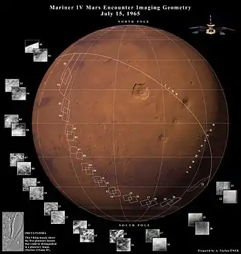 Маринер-4 пролетал около Марса 14-15 июля 1965 года. 14 июля в 15:41:49 UTC Маринер-4 был переключен в режим планетарного исследования. Телекамера начала свою работу в 00:18:36 UTC 15 июля, получены 21 полный снимок и частично 22 снимок (21 строка). Снимки делались через красный или зелёный фильтры, причем пары их перекрывались, чтобы получить больше информации об окраске поверхности. Число элементов изображения составляло 200×200, число уровней яркости — 64 (240000 битов, 200 строк по 200 пикселей, 6 битов на пиксель). Снимки располагались на поверхности Марса по узкой прерывистой дуге. Дуга начиналась от 40° с. ш., 170° в. д., пересекала экватор, проходила вблизи 35° ю. ш., 200° в. д. и пересекала терминатор на 50° ю. ш., 255° в. д. На снимках записано около 1% от всей поверхности планеты. На первом снимке виден яркий лимб (край) Марса, снимок 19 захватывает вечерний терминатор, а последние три, т.е. 20,21,22, приходятся на неосвещённые области. Сделанные снимки хранились на бортовом магнитофоне. Снимки были получены при разных дальностях, причем минимальная составляла 11800 км. 15 июля в 1:00:57 UTC аппарат пролетел от Марса на расстоянии 9846 км. В 2:19:11 UTC Маринер-4 оказался за Марсом, сигнал от аппарата прекратился. В 3:13:04 UTC сигнал от аппарата возобновился. После пролёта около Марса Маринер-4 был переключен в режим полета по межпланетной траектории. Передача изображений на Землю началась через 8,5 часов после возобновления сигнала, и продолжалась до 3 августа. Передача одного снимка со скоростью 8,33 бит/сек занимала 8,66 часа. Все снимки были переданы два раза, чтобы обеспечить отсутствие пропущенных или повреждённых данных. Передача снимков проходила с расстояния более 216 млн км.
