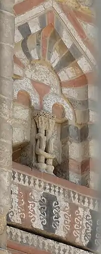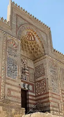 Фронтальный фасад — высокий и внушительный, отличающийся удивительным богатством орнамента и цвета[3][2]. И здесь, на внешней стороне, и вокруг арок главного зала/двора, находятся полосы резного камня, которые выглядят как связанные цепи и служат для обрамления различных элементов архитектурной композиции[2]. Вход расположен внутри монументального углублённого портала, увенчанного сводом или навесом из мукарн (сталактитоподобной резьбы) в прямоугольной раме, которая выступает выше, чем остальная часть фасада здания. Всё это представляет собой типичные элементы мамлюкской архитектуры[2]. В общем фасаде использована кладка аблак (чередующийся тёмно-красный и светлый камень), но более сложные узоры аблак находятся над дверным проёмом. На обеих боковых стенках портала расположены два «кругляка» с различными цветочно-геометрическими композициями, созданными с использованием красного камня[2]. За пределами портала над окнами по обе его стороны находятся два ещё более крупных круговых узора такого рода. Между ними и порталом находятся килевидные ниши, характерные для фатимидской архитектуры) с сияющим красным и светлым камнем, ниже которых находятся надписи на арабском языке (выполненные почерком сулюс или насх), написанные красной пастой или камнем, которые вместе, по-видимому, образуют шахаду[3][2]. Далее под этими надписями расположены панели «квадратного» куфического письма, созданные с помощью инкрустированных лазурью голубых плиток[2]. Примечательна одна необычная деталь над дверным проёмом: там, посередине двойного окна, расположены две небольшие декоративные колонны с резными змеями, обвивающими их, что может символизировать исцеление[1].