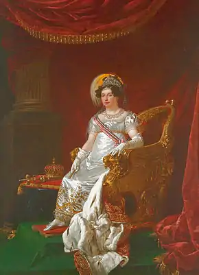 Король Фердинанд I умер 4 января 1825 года, передав престол сыну королю Франциску I. Мария Изабелла стала королевой Обеих Сицилий. На момент вступления на престол Франциску шел 47 год, он был достаточно крупным человеком, с благими намерениями, простой в манерах, интересовавшийся больше сельским хозяйством, нежели политикой.[20] Сельским хозяйством король активно занимался до вступления на престол.[21] Новый король был более образован чем его предшественник, однако слаб своей волей и характером. В своё короткое правления (правил в 1825—1830 года) он практически не управлял страной, передав всю власть в руки Луиджи дель Медичи, премьер-министра королевства,[21] своего камердинера Микеланджело Виджлиа и Катерины де Симон, фрейлины своей жены.[22]