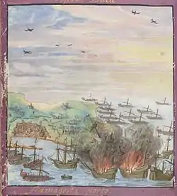 - Джованни СозоменоБольшая часть рабов, мужчин и женщин, была вывезена с острова. Самые юные, с очень богатой добычей, были погружены на галеон Мехмеда-паши, на карамболь и галеру, и предназначены в качестве подарков Великому синьору и Мехмеду-паше. Но одна из этих дам подожгла боеприпасы, от которых взорвались галеон, карамурсель и галера, и всех люди и запасы на борту, <...> Это было жалостное зрелище - видеть тела этих несчастных существ в воздухе: пусть Бог дарует мир их душам.Оригинальный текст (англ.)[показатьскрыть]The greater part of the slaves, male and female, were taken off the island. The flower of the youth, with much rich spoil, was embarked on a galleon of Mohammed Pasha, and on a caramosoUn and a galley destined as presents to the Grand Signor and to Mehmed Pasha. But one of these ladies set fire to the ammunition, which blew up with the galeon, the caramosolin and the galley, and all the persons and stores on board, except the captain, the clerk and some others who saved themselves by swimming ashore. It was a miserable sight to see the bodies of those unhappy beings in the air : may God give peace to their souls.