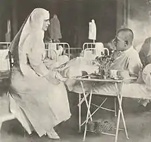 Несмотря на усилия Марии, Фердинанд колебался и, в конце концов, королева потребовала от супруга в недвусмысленных выражениях, чтобы он вступил в войну; это заставило французского министра в Румынии Огюста Феликса де Бопуи, графа Сен-Аулера, отметить, что Мария была дважды союзником французов: по рождению и по зову сердца[93]. Фердинанд уступил жене и 17 августа 1916 года подписал договор с Антантой, а уже 27 августа Румыния официально объявила войну Австро-Венгрии[94]. Сен-Аулер писал, что Мария «приняла войну так, как другие принимают религию»[95]. Сообщив детям о вступлении Румынии в войну, Фердинанд и Мария уволили своих немецких слуг, которые могли оставаться на службе только в качестве «военнопленных»[96]. В начале войны королева участвовала в оказании помощи Румынскому Красному кресту и ежедневно посещала госпиталя[97]. За первый месяц боевых действий Румыния провела не менее девяти боёв, часть из которых проходила на румынской земле[98].