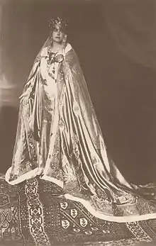 ![]() Мария, королева Румынии, облачённая в символы власти. Фотограф Джордж Грэнтем Бейн | |