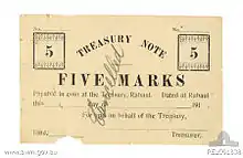 5 марок | 1894 | На аверсе обозначение номинала, год, по бокам бамбуковые ветви и надпись NEU-GUINEA COMPAGNIE, на реверсе райская птица | A | 23 000[6]позднее 3 906 экземпляров переплавлено | |||