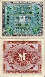 - французская зона: 1/2, 1, 5, 10, 20, 50, 100, 1000 марок;