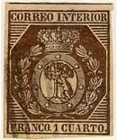 В ноябре 1852 года сбор за пересылку простых писем в Испанию в пределах Мадрида был снижен до 1 куарто (cuarto)[4]. В январе 1853 года[5] (по другим данным, в апреле[4]) для городской почты Мадрида были эмитированы две почтовых марки номиналом в 1 и 3 куарто. На марках был изображён герб города и помещена надпись на испанском языке «Correo Interior» («Внутренняя почта»)[5]. Они были напечатаны типографским способом бронзовой краской, и это был первый случай использования металлической краски для печатания почтовых марок[4]. 31 октября 1854 года марки были изъяты из обращения[5]. [[Файл:Shanghai stamp 1877 - 1 candareen on 12 candareen.jpg|thumb|130px|upright|{{small|Надпечатка нового номинала в 1 кандарин на марке городской почты Шанхая в 12 кандаринов (1877)]]
