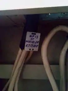 - Маркировка кабельных окончаний — маркировка в виде надписей, условных знаков, бирок и этикеток, наносимая на окончания кабельных линий с целью идентификации кабеля (жилы, отдельного проводника) при его последующем подключении, например, к кроссу в телефонии, (пере)коммутации и пр.