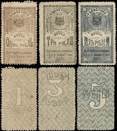 К середине 1919 года в Амурской области полностью отсутствовали мелкие разменные денежные знаки и мелкие монеты. Это обстоятельство вынудило Амурскую областную земскую управу выпустить собственные разменные земские марки-деньги достоинством в 50 копеек, 1, 3 и 5 рублей. Выпуск в обращение этих марок происходил по декабрь 1919 года, а общая сумма выпуска достигла 18 млн рублей. Земские марки-деньги имели форму общегосударственных гербовых марок, на лицевой стороне был изображен герб области и напечатано: «Амурское Областное Земство / почта / выпускается на основании п. 5 ст. 2 закона 17-го июня 1917 года» и сумма марки; на оборотной — цифрой проставлено достоинство данной марки. Марки Земства были широко распространены в области. Изъяты из обращения при девальвации в 1920 году[10].