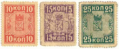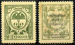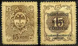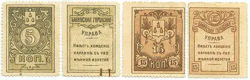 | Марки-деньги Минераловодского городского самоуправления | Марки-деньги Бакинской городской управы (1918) |