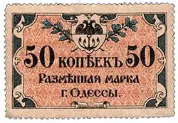 В конце 1917 — начале 1918 года Одесса столкнулась с проблемой нехватки наличности, решением которой стал выпуск собственных денег. Помимо рублёвых банкнот, в первые месяцы 1918 года стали печататься и входить в оборот городские разменные марки. В марте были выпущены марки-деньги номиналом в 50 копеек, в апреле — в 15 и 20 копеек. На их лицевой стороне был изображён герб Одессы в орнаментальном обрамлении, на оборотной — номинал в розетке, рамка и надпись: «Размѣнная марка г. Одессы поддѣлка преслѣдуется закономъ». Рисунок марок был выполнен художником Амвросием Ждахой[4].