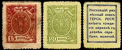 В июле 1918 года СНК Терской республики под председательством Ю. Г. Пашковского был осуществлен выпуск разменных знаков достоинством в 10, 15 и 20 копеек. Марки-деньги отпечатаны на мелованной бумаге с зубцами. На их лицевой стороне изображены двуглавый орёл на овальном щите, за которым перекрещенные меч в ножнах и лавровая ветвь, вверху буквы «Т. Р.» на ленте. На оборотной стороне надпись: «Настоящій размѣнный знакъ ТЕРСК. РЕСП. имѣетъ хожденіе наравнѣ с размѣн. серебрян. монетой».