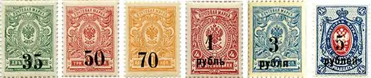 В сентябре или октябре 1919 года[9] Омским правительством адмирала А. В. Колчака была произведена эмиссия из шести марок с зубцами и четырёх — без зубцов (Mi #1A—4B; Yt #1—10) на марках Российской империи 17-го и 21-го выпусков с надпечаткой нового номинала. Надпечатки производились в Экспедиции заготовления государственных бумаг Омского правительства в Омске.