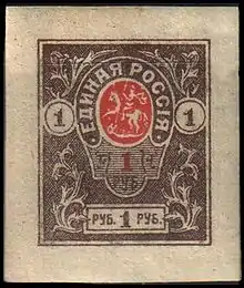 ![]() Марка Главного командования Вооружёнными силами Юга России (1919]): «Единая Россія» (Mi #6B; Yt #39) |