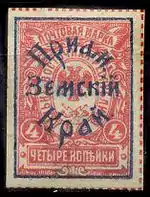 Первый выпуск представлял собой литографскую надпечатку тёмно-синей и оранжево-красной в рамке надписи в три строки церковно-славянским шрифтом «Приам. Земскій Край» на марках ДВР. Второй — литографская надпечатка тёмно-синей краской в рамке аббревиатуры «П. З. К.» и трёх горизонтальных линий (по буквам «ДВР») на марках ДВР. Надпечатка третьего и четвёртого выпусков была аналогична первому, однако ставилась она на марках Омского правительства и Российской империи 17-го, 20-го и 21-го выпусков, соответственно.