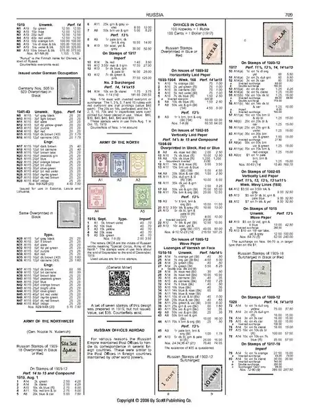 | Страница каталога «Скотт» (том 5, секция марок России), показывающая в числе других выпуски периода Гражданской войны |