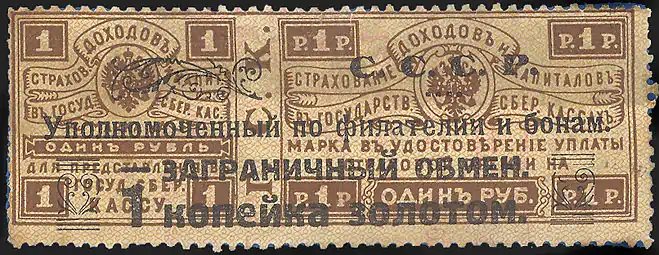 В связи с этим 1 декабря 1923 года вышли новые марки контрольного сбора для заграничного обмена. На марках страхового сбора Российской империи была сделана надпечатка: «СССР. Уполномоченный по филателии и бонам. Заграничный обмен» и сумма сбора. Бывшие до этого времени в обращении марки контрольного сбора аннулировались. В это же время был введён в употребление новый штемпель гашения марок контрольного сбора.