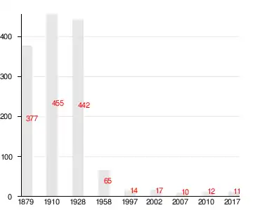 Число жителей по семейным спискам 1879 г.: 189 м. п., 188 ж. п.; по приходским сведениям 1879 г.: 162 м. п., 163 ж. п.[4]