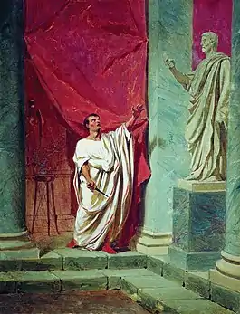 Заговорщики решили убить диктатора на последнем заседании сената перед его отбытием в парфянский поход — в курии Помпея в иды марта (15 марта 44 года до н. э.)[157]. Источники сообщают, что в этот день с утра Брут, опоясанный кинжалом под тогой, творил суд, действуя с удивительным хладнокровием. Именно к нему и Кассию перед заседанием подошёл сенатор Попилий Ленат, чтобы сказать шёпотом: «Всей душой желаю вам счастливо исполнить то, что задумали, но советую не медлить: про вас уже заговорили». Вскоре Марку сообщили, что его жена внезапно почувствовала себя плохо и находится при смерти, но он не пошёл домой, ожидая Цезаря, который задерживался[158][159][160].