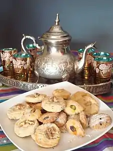 Мятный чай — важнейший марокканский напиток, его пьют как без особого повода, так и с гостями, в последнем случае приготовление чая включает разливание из чайника в стакан с метровой высоты[5]. К чаю подают сладости, в частности, «каб-эль-газаль», небольшие печенья с тёртым миндалём[8].