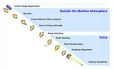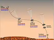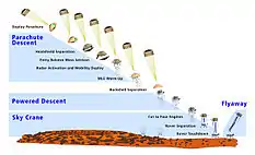 | «Небесный кран» | ![]() | После того, как теплозащитный экран и тыльная часть капсулы выполнят свою задачу, они расстыковываются, тем самым освобождая путь для спуска аппарата и позволяя радару определить место посадки. После расстыковки кран обеспечивает точный и плавный спуск марсохода на поверхность Марса, который достигается за счёт использования реактивных двигателей и контролируется с помощью радиолокатора на марсоходе. |