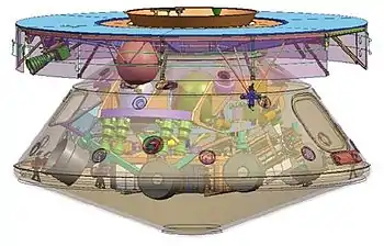 | Тыльная часть капсулы | ![]() | Капсула необходима для спуска через атмосферу. Она защищает марсоход от влияния космического пространства и перегрузок во время входа в атмосферу Марса. В тыльной части находится контейнер для парашюта. Рядом с контейнером установлено несколько антенн связи. |