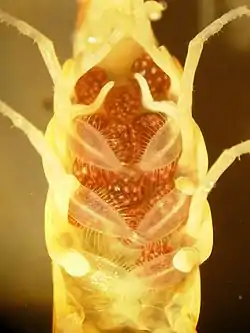 Вид самки бокоплава Orchestia gammarellus с брюшной стороны. Видны оостегиты.