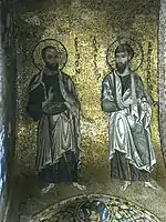 Нижняя поверхность входной арки, как и ранее описанной триумфальной, содержит семь мозаичных портретов. В данном случае это — мученики (слева направо): Иоанн, Авксентий, Орест, Евстратий, Евгений, Мардарий и Павел. Иоанн и Павел являются, скорее всего, римскими мучениками IV века; пятеро остальных пострадали в Севастии Арменской при Диоклетиане[26].
